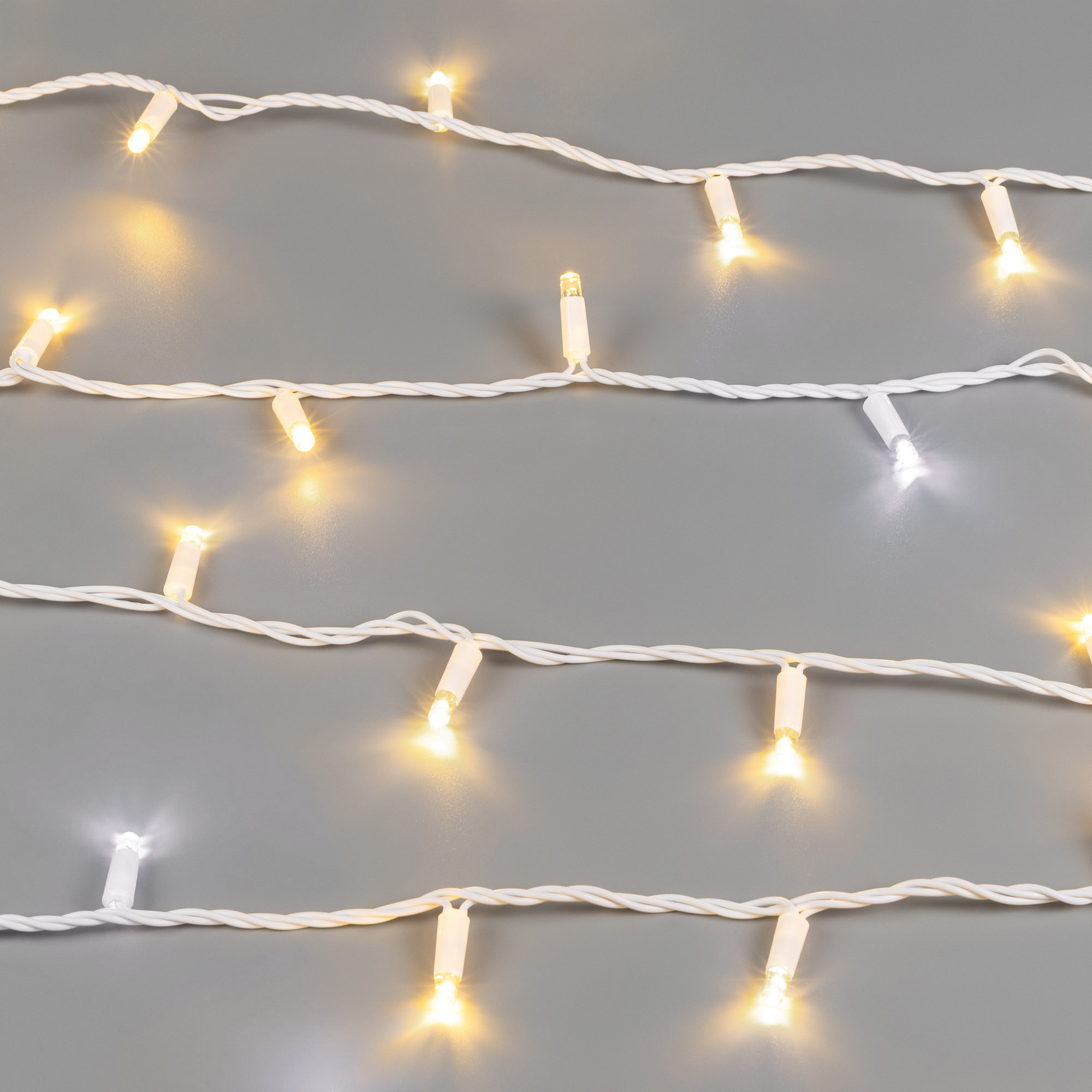 Светодиодная нить Pro. Размер 10000 мм. 100 светодиодов размером 7 мм. Основной цвет свечения ТЕПЛЫЙ БЕЛЫЙ (3000 К), эффект мерцания редких точек (БЕЛЫЙ 6000К) с резким световым рисунком (прозрачная вогнутая линза), соотношение светодиодов: 84 теплых постоянного свечения / 16 белых с мерцанием. Эффект частого мерцания. Провод белый, каучук. Питание 230 В, Мощность 7 Вт, защита IP65, применение в помещении и на улице под навесом. Аксессуары для подключения и управления приобретаются отдельно.