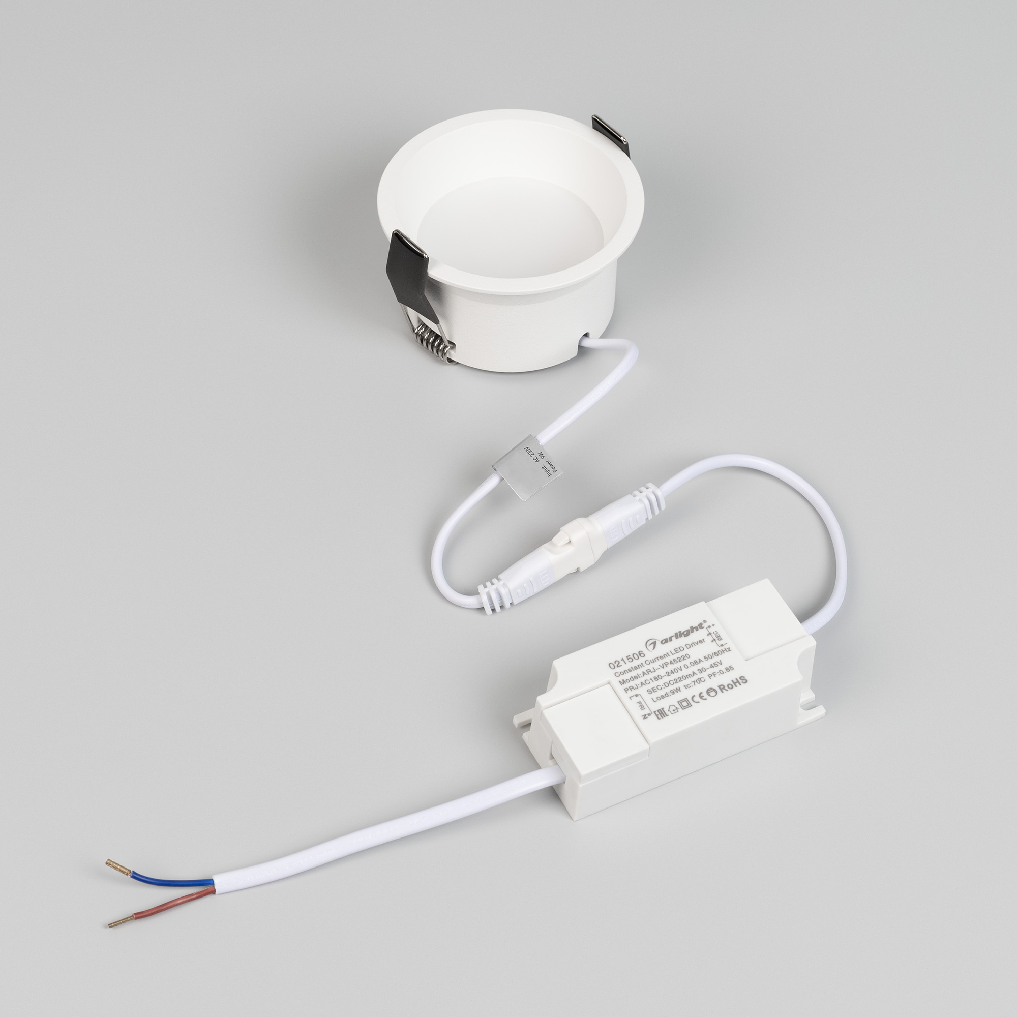 Встраиваемый светильник даунлайт. Мощность 9 Вт, св. поток 595 лм, 66 лм/Вт, дневной 4000 K, CRI>90, угол 85°, напряжение питания 230 В. Белый круглый корпус из алюминия, степень защиты IP20. Размер: диаметр 82 мм, высота 46 мм. Монтаж встраиваемый, установочное отверстие: диаметр 75 мм. Драйвер 27-42 В, 200 мА, пульсация <2%.