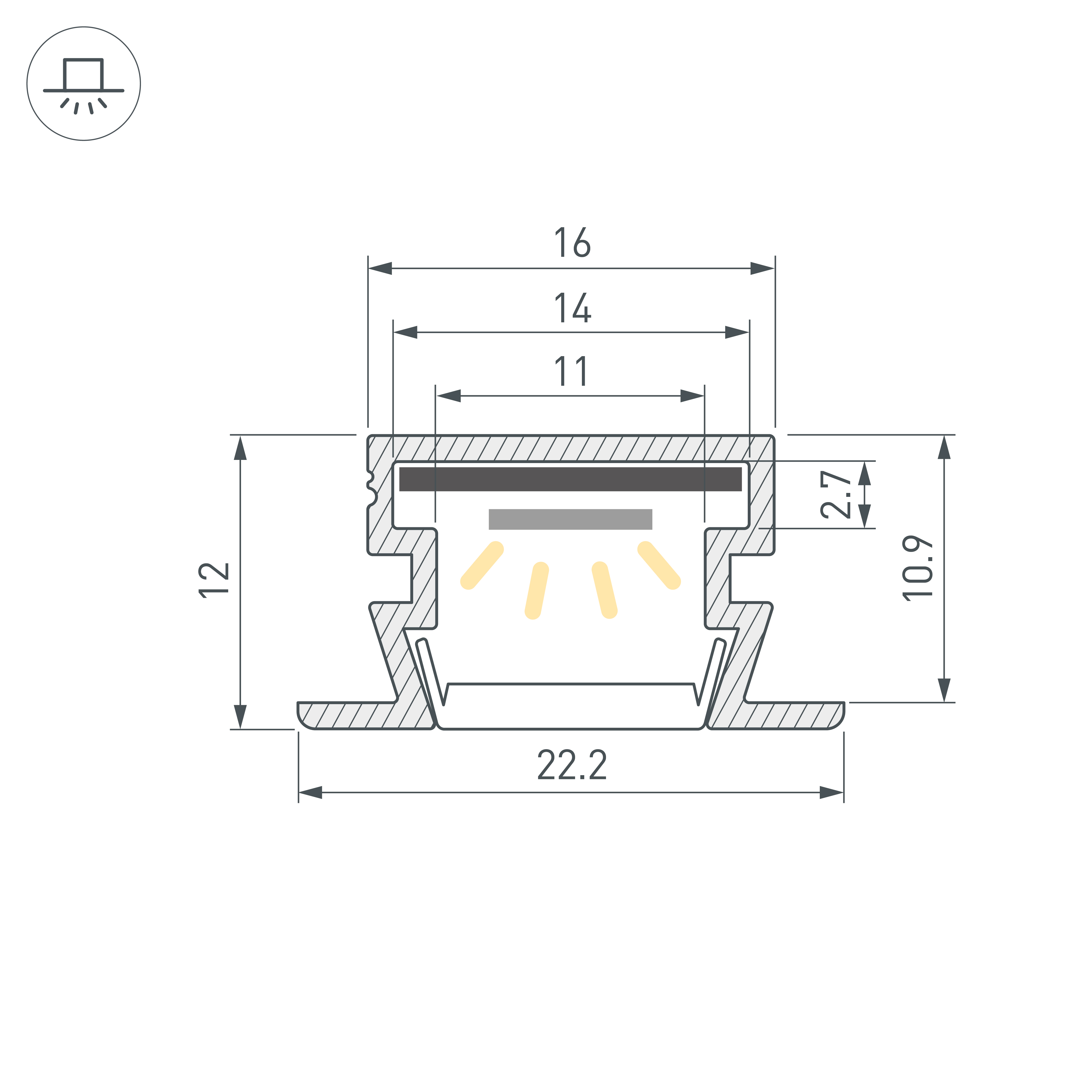 Встраиваемый профиль с накладным фланцем из анодированного алюминия для контурной подсветки. Габаритные размеры профиля составляют 2000 мм в длину, 22,2 мм в ширину и 12 мм в высоту. Площадка для установки светодиодных лент позволяет использовать ленту шириной до 14 мм и мощностью до 16,4 Вт/м. Это обеспечивает гибкость в выборе светодиодных лент и создает потрясающие световые решения. Экраны, заглушки и другие аксессуары не включены в комплект и приобретаются отдельно. Цена указана за 1 метр профиля. Отличное решение для создания современных световых проектов.