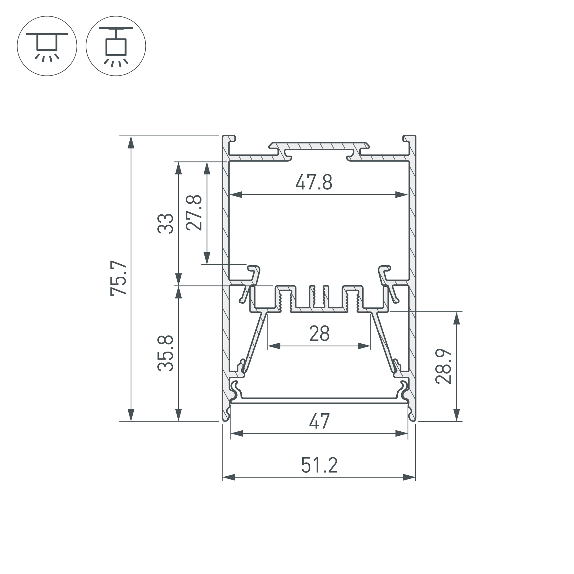 Подвесной/накладной профиль черного цвета из алюминия для основного освещения и контурной подсветки. Возможность установки антибликовой решетки Honeycomb поверх экрана позволяет получить более комфортное для глаз освещение. Отсек для блока питания (47,8х27,8 мм) и съемная площадка для светодиодной ленты значительно облегчают сервисное обслуживание осветительного оборудования. Габаритные размеры профиля составляют 2000 мм в длину, 51,2 мм в ширину и 75,7 мм в высоту. Площадки для установки светодиодных лент позволяют использовать ленты шириной до 28 мм и мощностью до 46 Вт/м. Это обеспечивает гибкость в выборе светодиодных лент и создает потрясающие световые решения. Экраны, заглушки и другие аксессуары не включены в комплект и приобретаются отдельно. Цена указана за 1 метр профиля. Отличное решение для создания современных световых проектов.