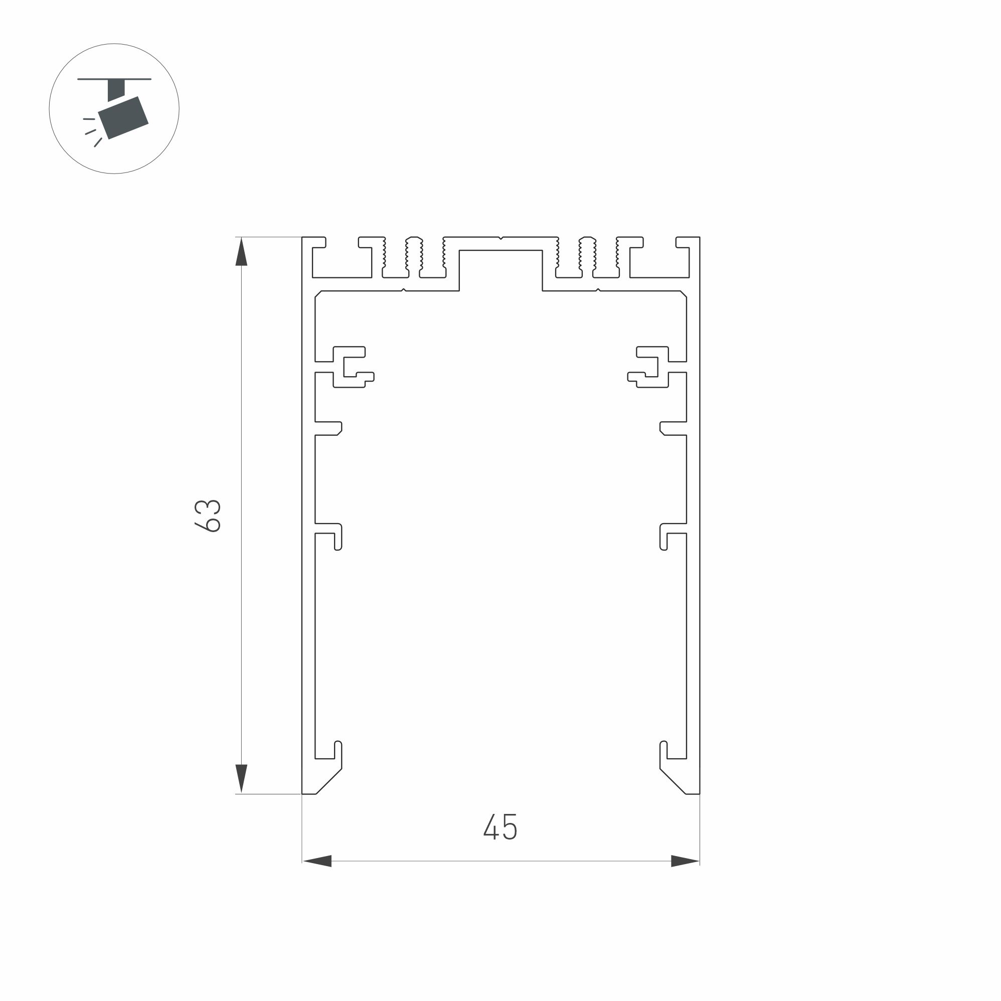Подвесной, накладной, встраиваемый в нишу магнитный трек. Длина 3000мм. DC24V. Материал алюминий, цвет черный. Две заглушки в комплекте. Размер ДxШxВ: 3000x45x63мм. Размер (с учетом заглушек) ДxШxВ: 3006x45x63мм. Аксессуары для подвесного монтажа в комплект не входят. Позволяет создать адресное управление по DALI.