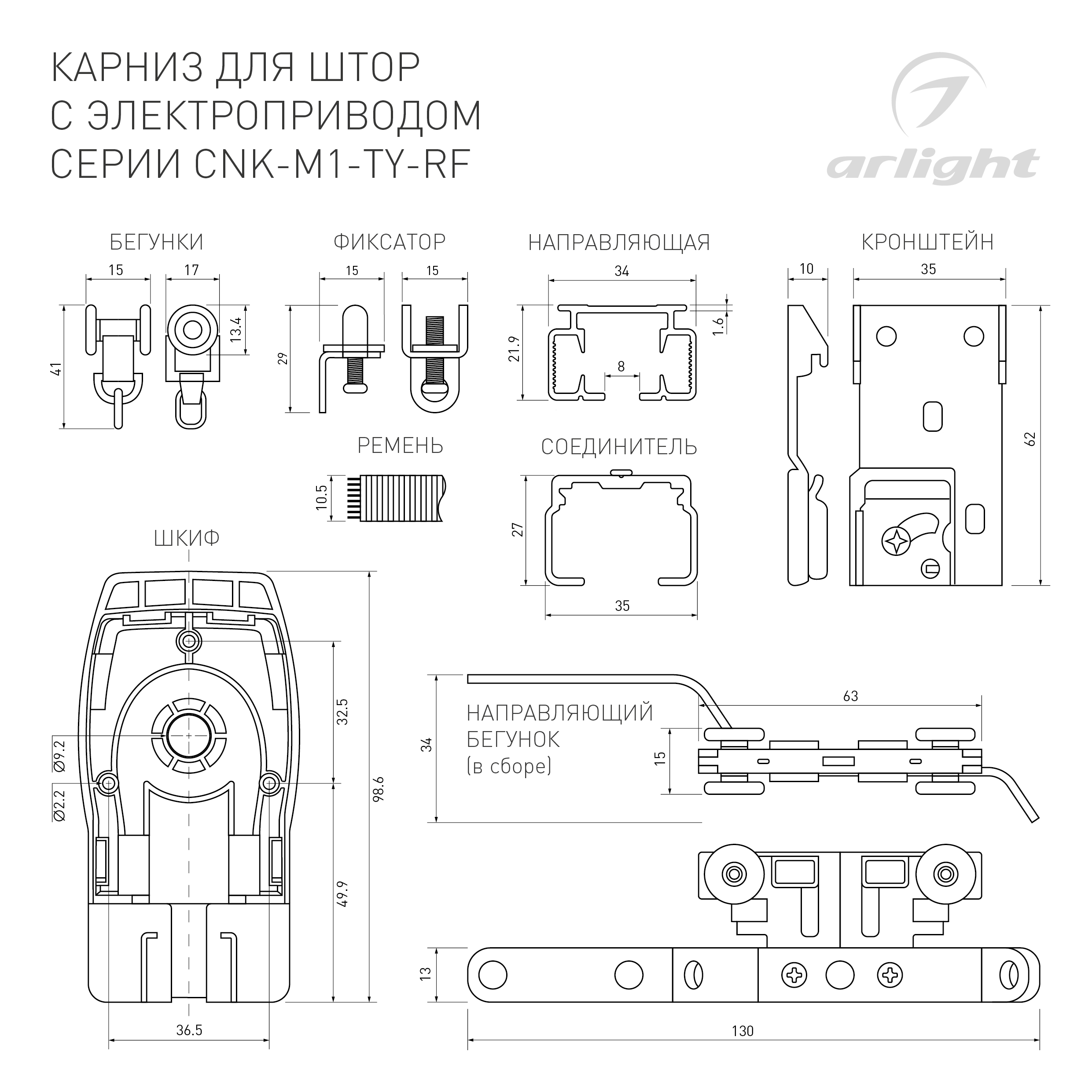 1 мотор, 1 пульт дистанционного управления, алюминиевый профиль 1,6 мм (1м - 2шт, 0.5м - 1шт, 0.2м - 2шт., 0.1м - 1 шт.), 2 соединителя 10 см, 1 соединитель 20 см, 1 переходник 5 см, 2 шкива, 2 пряжки ремня, 2 направляющих бегунка, ремень 6,4 м, 24 бегунка, 2 фиксатора, 6 кронштейнов, 1 зажим на ремень