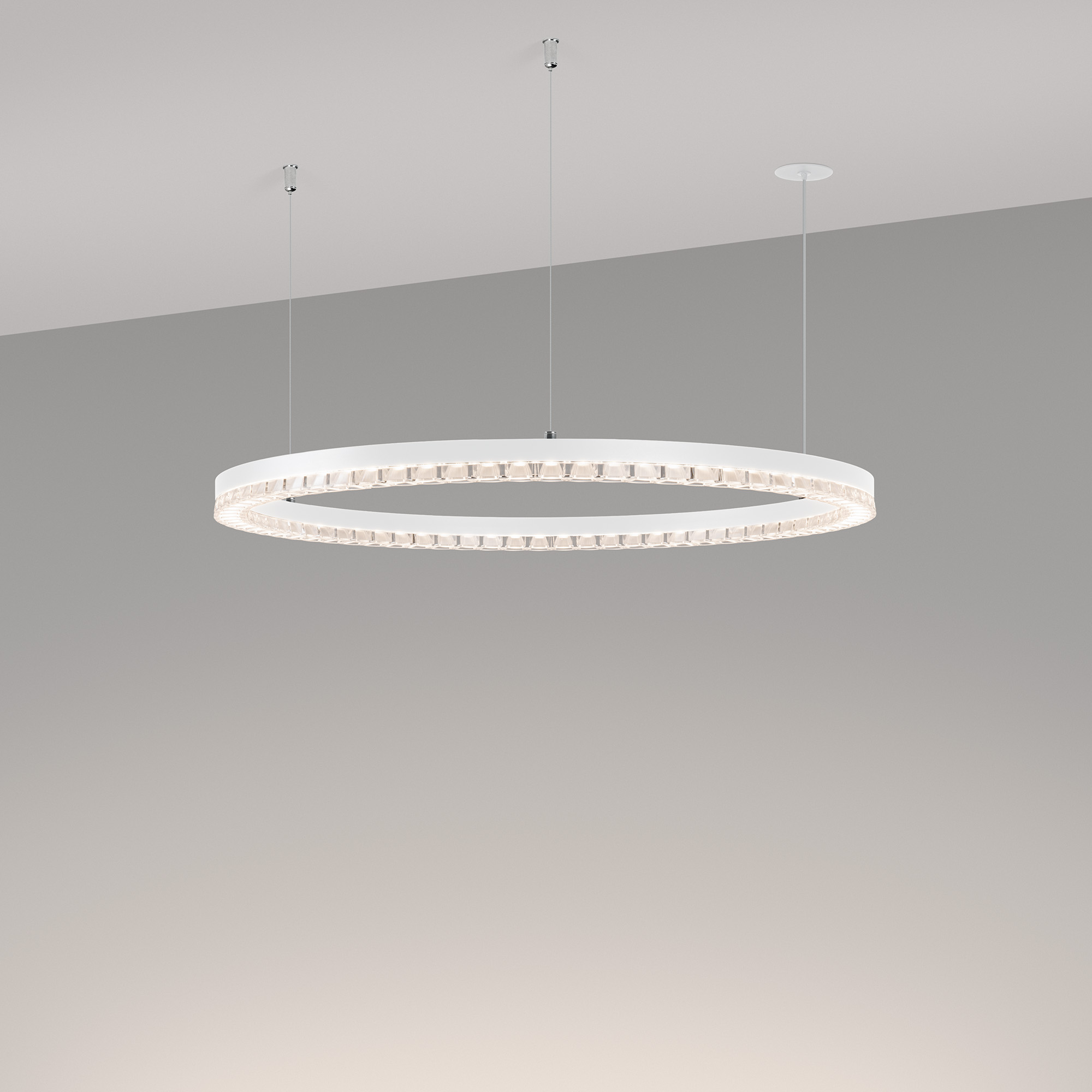 Под заказ. Подвесной светильник. Мощность 36 Вт, св. поток 3160 лм, 80-95 лм/Вт, дневной белый 4000K, CRI>90, угол 45°, напряжение питания 230 В. Белый круглый корпус из алюминия, экран PMMA, степень защиты IP20. Размер: диаметр 650 мм, высота 34 мм, ширина профиля 30 мм, размер чаши: диаметр 65 мм, высота 26 мм. Монтаж подвесной, длина подвеса 1200 мм, тип чаши встраиваемый, диаметр установочного отверстия чаши 60 мм. Драйвер 27-38 В, 1050 мА. Пульсация <0,3 %.
