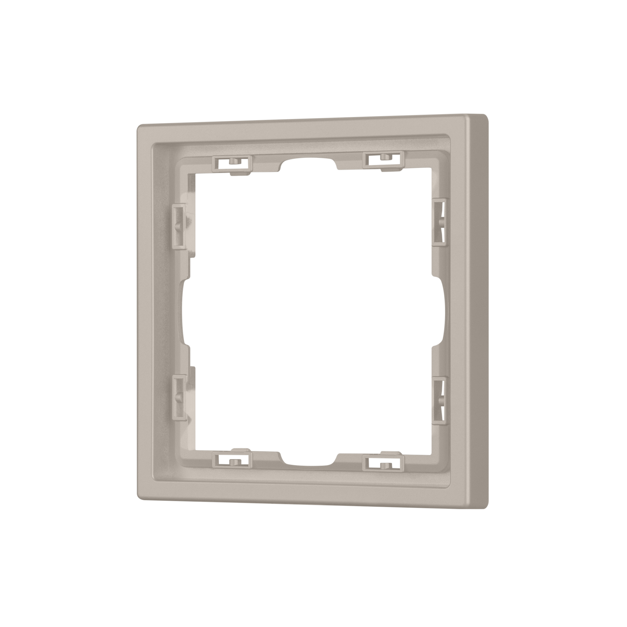 Корпус рамки выполнен в цвете кашемир и имеет покрытие Soft-Touch, что придает изделию приятные тактильные свойства. Толщина корпуса составляет 8,5 мм, что позволяет эффективно интегрировать рамку в интерьерные решения любого уровня сложности.