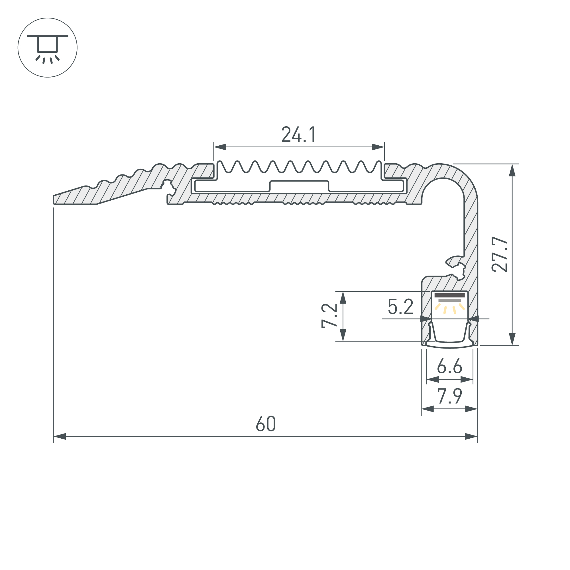 Накладной профиль из анодированного алюминия черного цвета для подсветки ступеней с антискользящей вставкой шириной 24,1 мм. Габаритные размеры профиля составляют 2000 мм в длину, 60 мм в ширину и 27,7 мм в высоту. Площадка для установки светодиодных лент позволяет использовать ленту шириной до 5,2 мм и мощностью до 31,5 Вт/м. Антискользящая вставка идет в комплекте с профилем. Экраны и заглушки не включены в комплект и приобретаются отдельно. Цена указана за 1 метр профиля. Отличное решение для создания современных световых проектов.