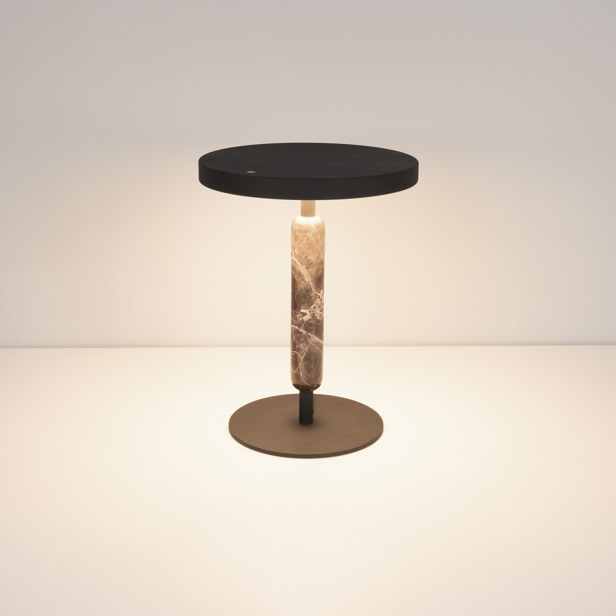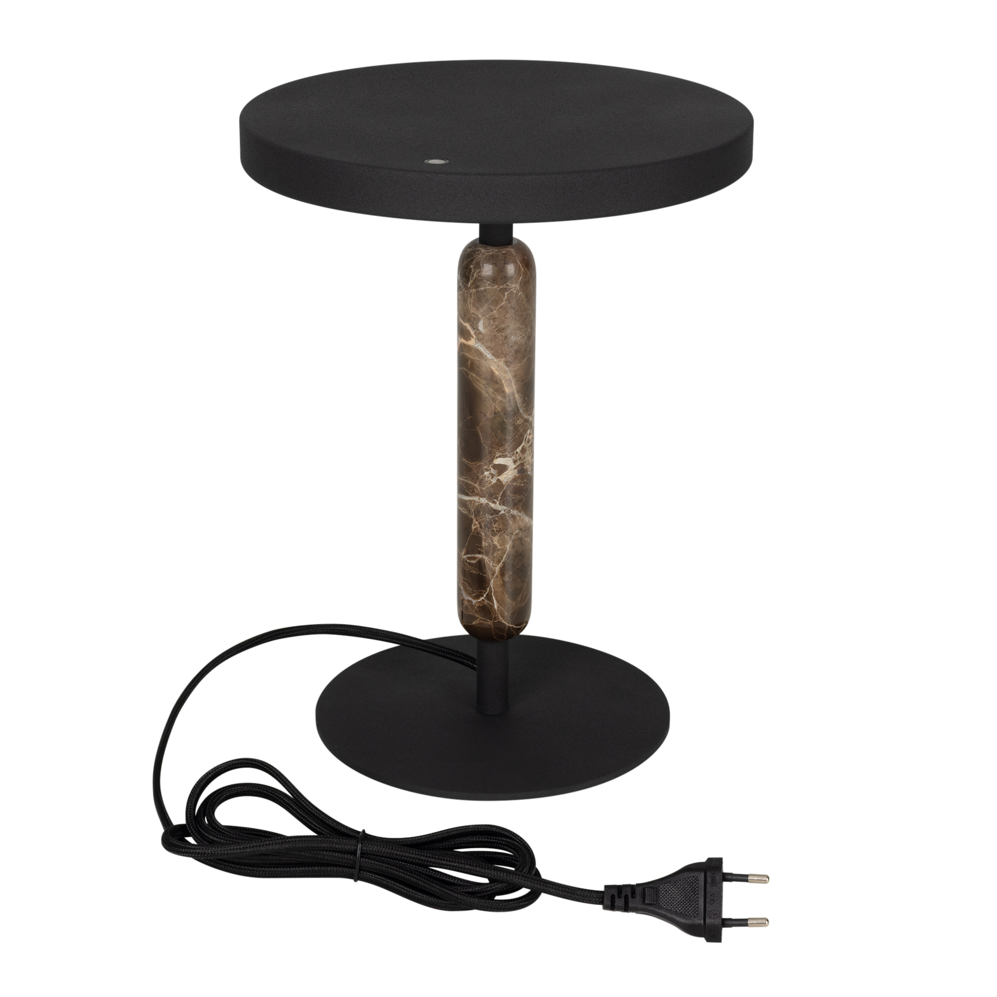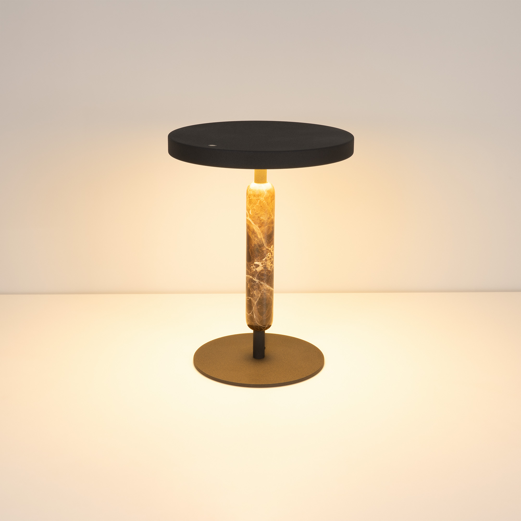 Настольный светильник ALYSS. С изменяемой цветовой температурой 2700/3200/4000К, переключается коротким нажатием на сенсорную кнопку на плафоне, диммирование происходит за счет ее удержания. Мощность 5 Вт, св. поток 195 лм, 39 лм/Вт, CRI>92, угол 110°, напряжение питания 230 В. Черный корпус из алюминия, декоративная вставка из мрамора, степень защиты IP20. Размер: диаметр 225 мм, высота 300 мм. Пульсация <1%.