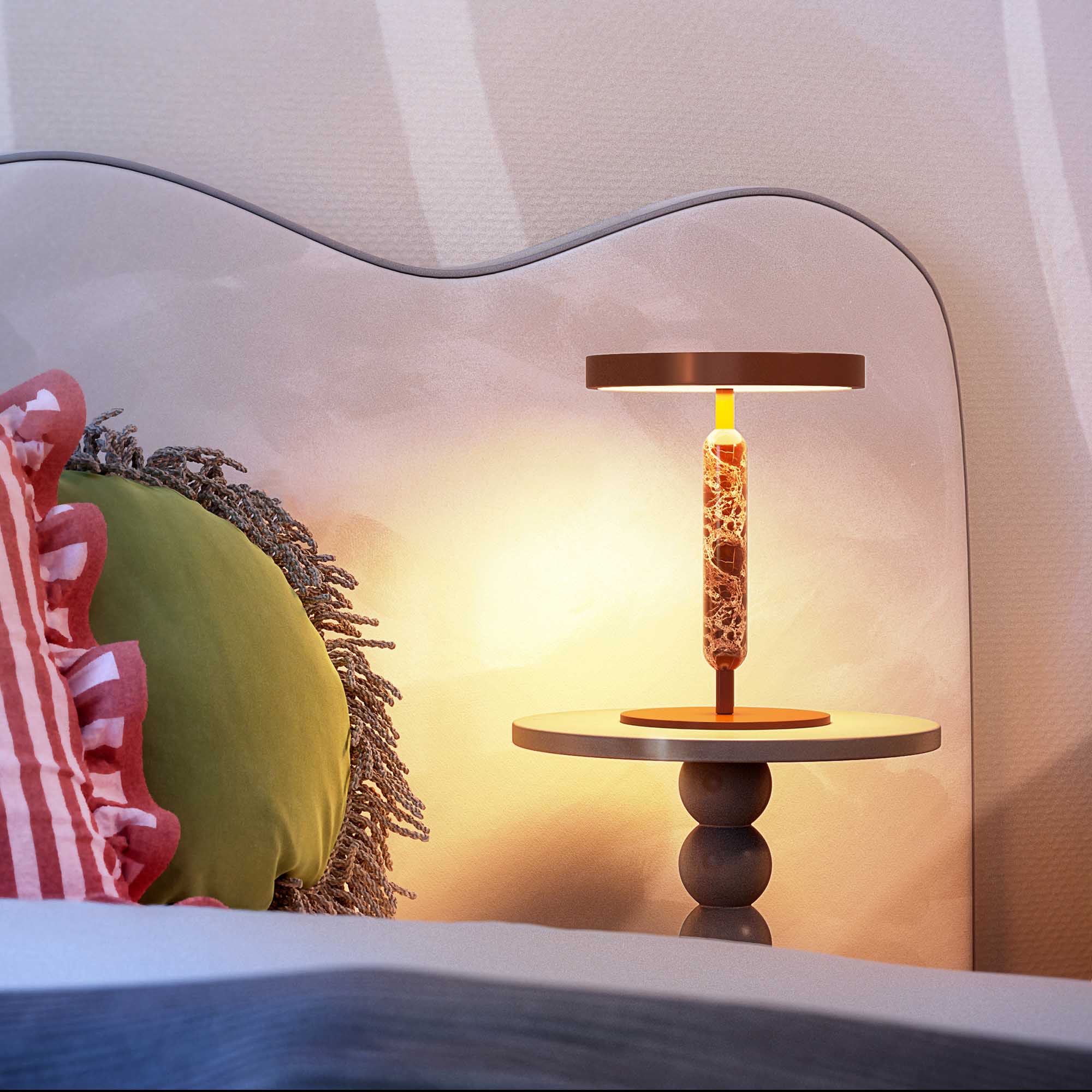 Настольный светильник ALYSS. С изменяемой цветовой температурой 2700/3200/4000К, переключается коротким нажатием на сенсорную кнопку на плафоне, диммирование происходит за счет ее удержания. Мощность 5 Вт, св. поток 195 лм, 39 лм/Вт, CRI>92, угол 110°, напряжение питания 230 В. Корпус из алюминия цвета бургунди, декоративная вставка из мрамора, степень защиты IP20. Размер: диаметр 225 мм, высота 300 мм. Пульсация <1%.
