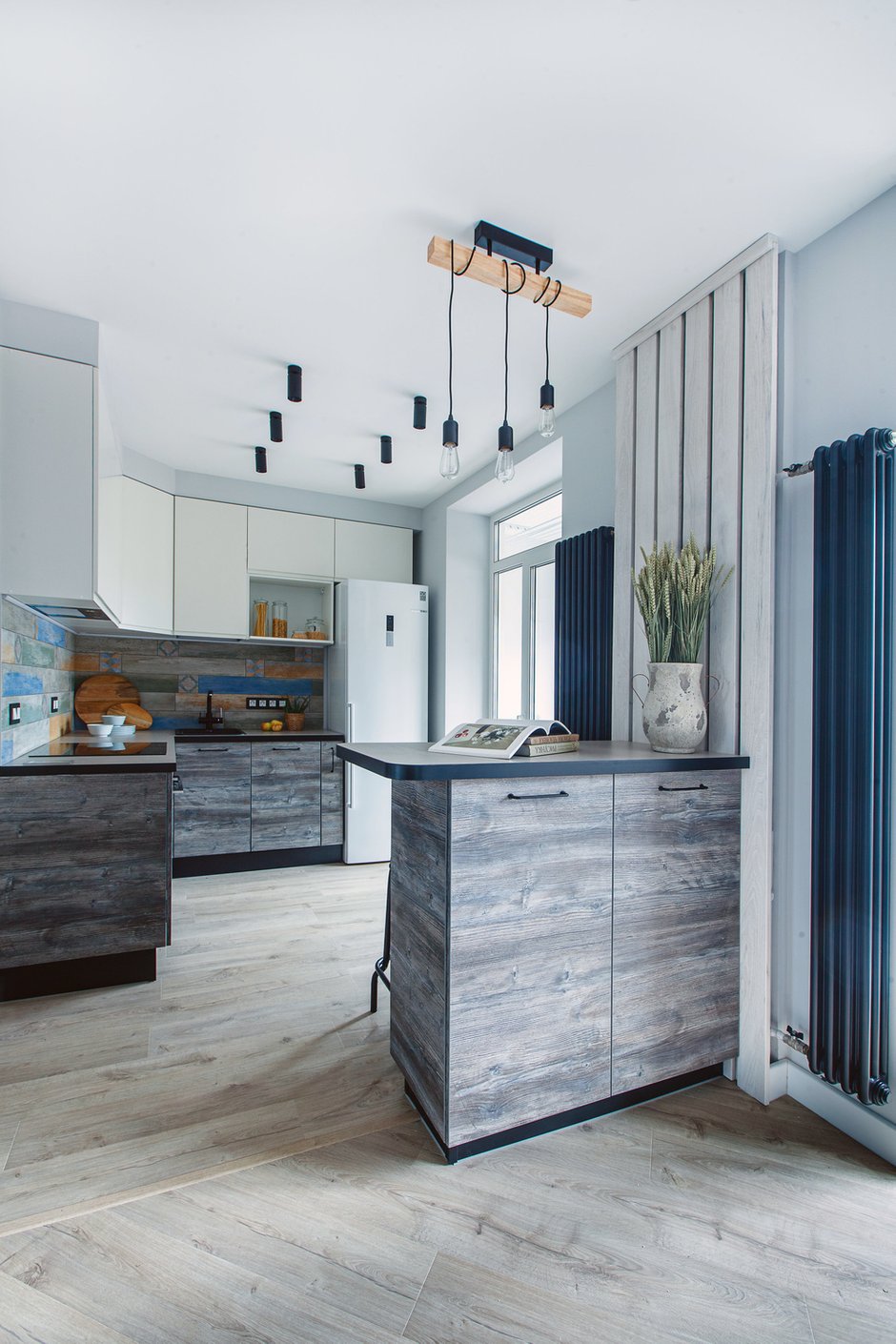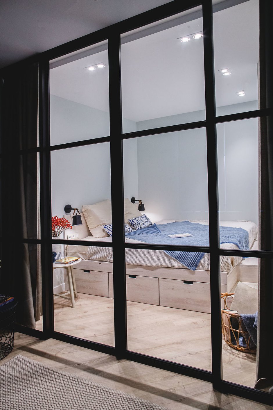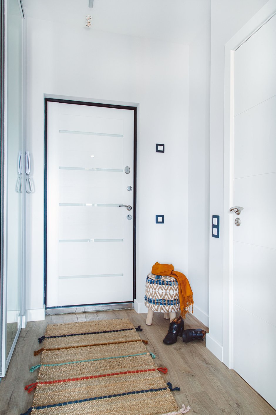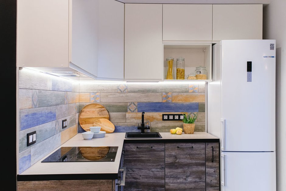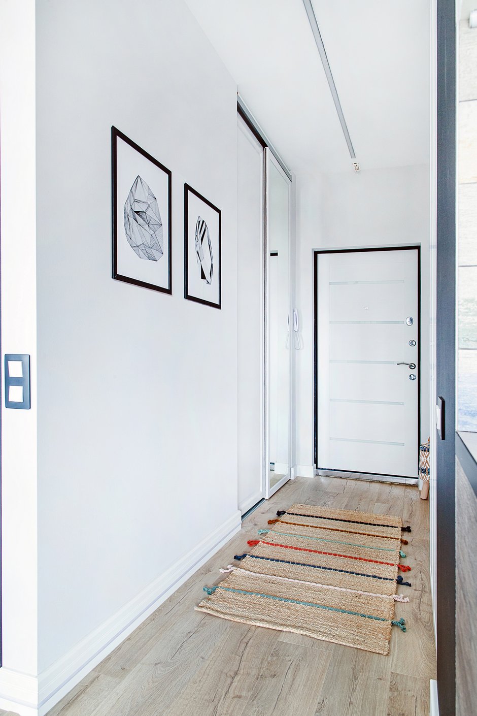 В интересном дизайнерском проекте используется разноплановое освещение, которое гармонично дополняет интерьер. Можно рассмотреть каждую деталь, цветовые акценты и безупречные белоснежные поверхности. Освещение в кухне-гостиной реализовано с помощью мобильных трековых светильников — они могут легко перемещаться вдоль шины и менять угол излучения света. Все светильники имеют высокий индекс цветопередачи (CRI>90). Для подсветки в коридоре использованы встраиваемый профиль и светодиодная лента теплого свечения.