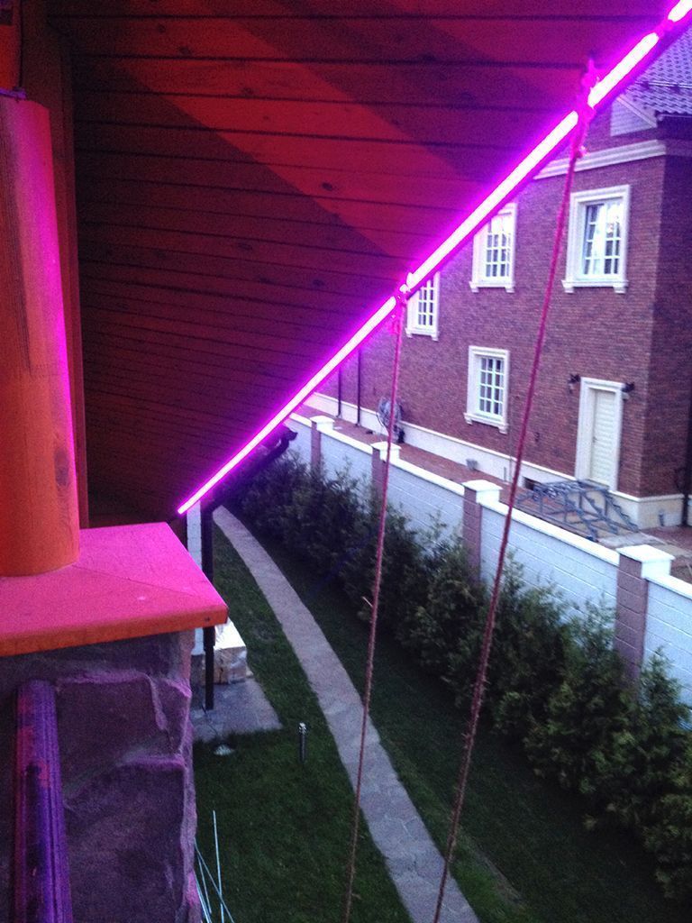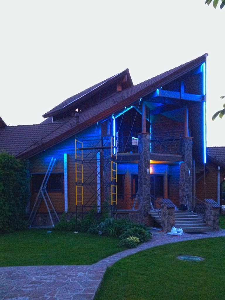 Наружная многоцветная светодиодная подсветка загородного дома позволила сделать его особенным и выделить его среди прочих в тёмное время суток.