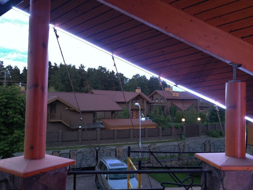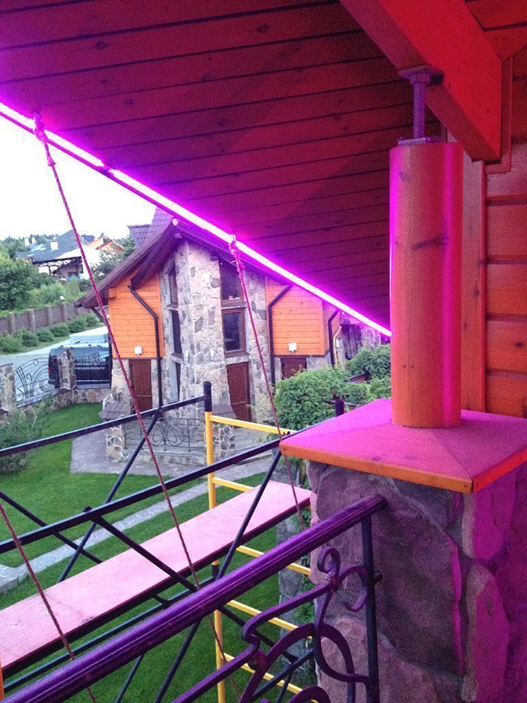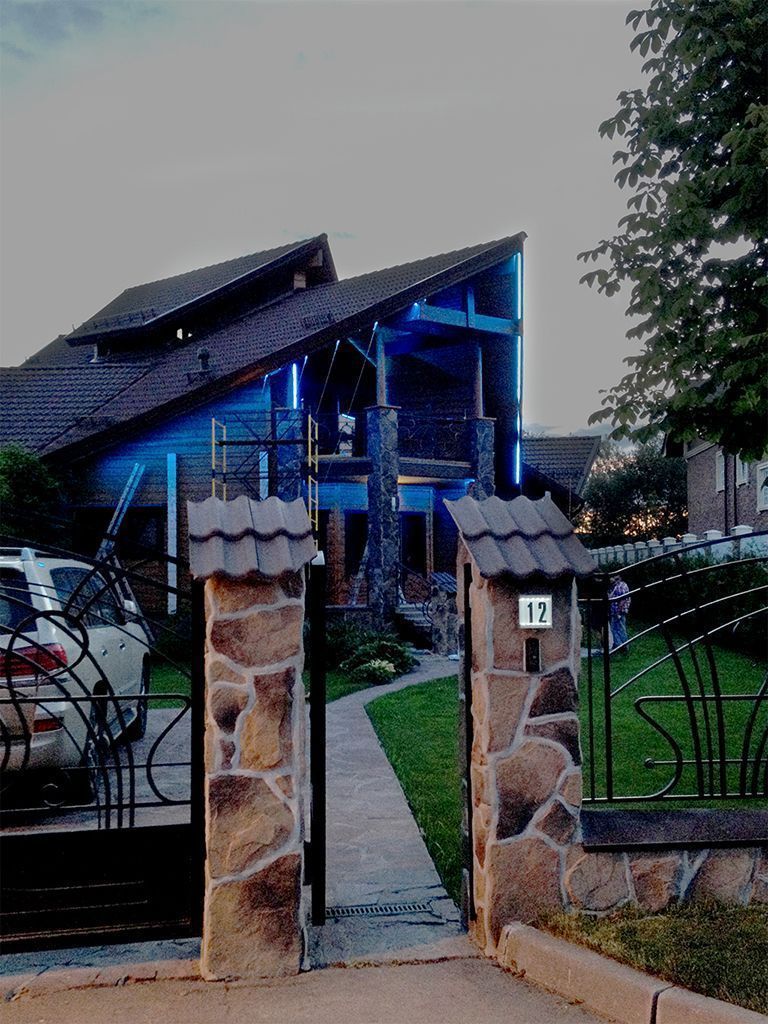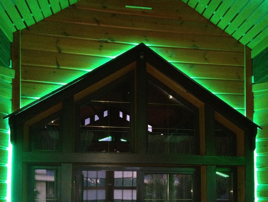 В данном проекте была реализована фасадная светодиодная подсветка коттеджа. Для этого светодиодная лента arlight® была установлена под крышу, вдоль её края. Так как подсветка установлена снаружи дома, высока вероятность того, что на неё может попасть дождь, снег или просто пыль, поэтому была применена герметичная светодиодная лента со степенью защиты IP67. Подсветка фасада коттеджа несёт в первую очередь декоративную функцию, поэтому была выбрана многоцветная RGB светодиодная лента. Цвет и яркость подсветки легко регулируются с сенсорного пульта ДУ, работающего в паре с RGB-контроллером arlight®.