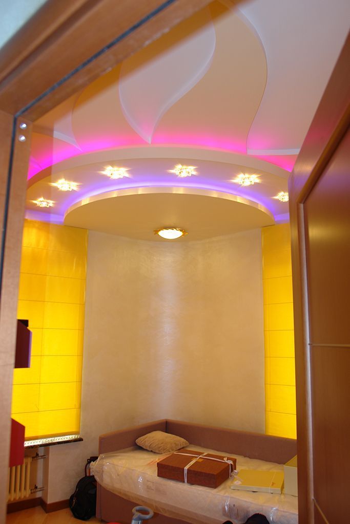 По периметру гостиной расположился карниз, украшенный декоративной лепниной. В нём была установлена светодиодная лента arlight® синего свечения. Такая же лента была применена в подсветке многоуровневого потолка спальной комнаты.