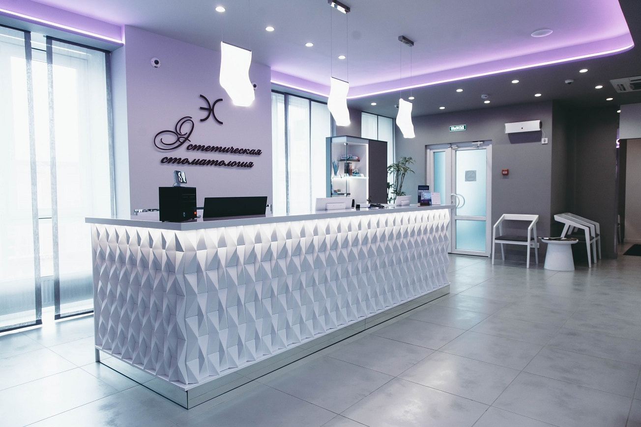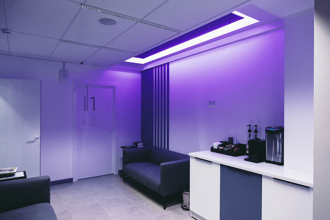Фирменный цвет клиники «Эстетическая стоматология» — фиолетовый: он ассоциируется у клиентов с роскошью и элитарностью, что подсознательно внушает доверие. Нежно-фиолетовая подсветка на потолке в зоне ресепшен, созданная на основе RGBW-ленты серии LUX, становится частью оформления бренда.
