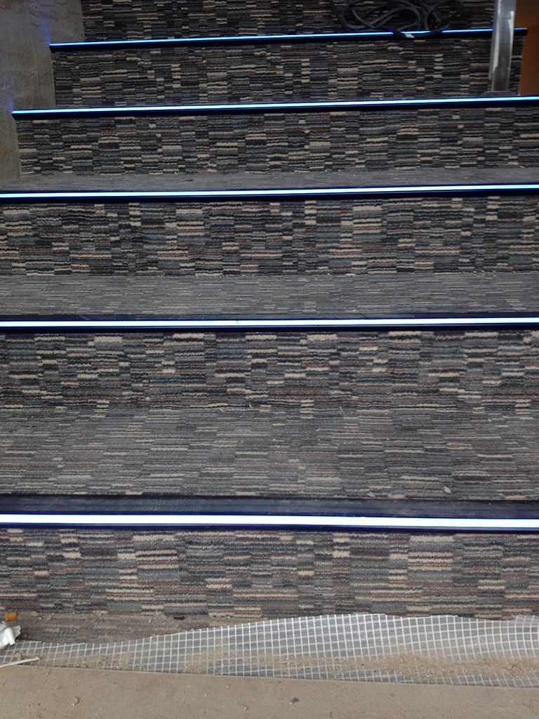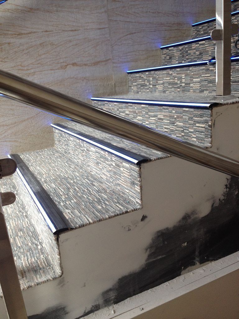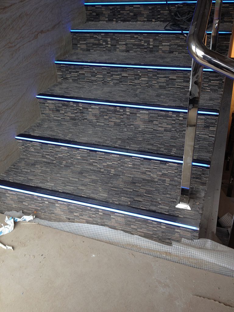 А если ступень не выпирает и представляет собой простой угол, то на помощь приходит специальный алюминиевый профиль для подсветки ступеней лестницы. Профиль монтируется накладным способом на угол ступени. Внутрь него устанавливается открытая светодиодная лента, паз, в котором она установлена, затем закрывается специальной вставкой. Эта вставка пропускает свет от ленты, создавая эффект световой линии, и одновременно она является противоскользящим элементом.