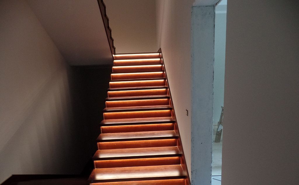 Самый простой способ организовать подсветку лестницы - установить светодиодную ленту на нижнюю сторону её ступеней. Такой способ подойдет, если край ступени немного выпирает или ступень вовсе отдельная. При такой установке светодиодной ленты верхняя ступень будто освещает нижнюю. Ступени хорошо освещены, но при этом лента не бросается в глаза и не слепит, т.к. светодиоды направлены вниз. Для такого способа установки обычно применяется влагозащищённая светодиодная лента со степенью защиты IP65, дабы уберечь её от попадания влаги при проведении влажной уборки. Другой вариант - использовать открытую светодиодную ленту, установленную в алюминиевый профиль с экраном.