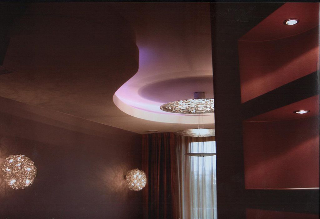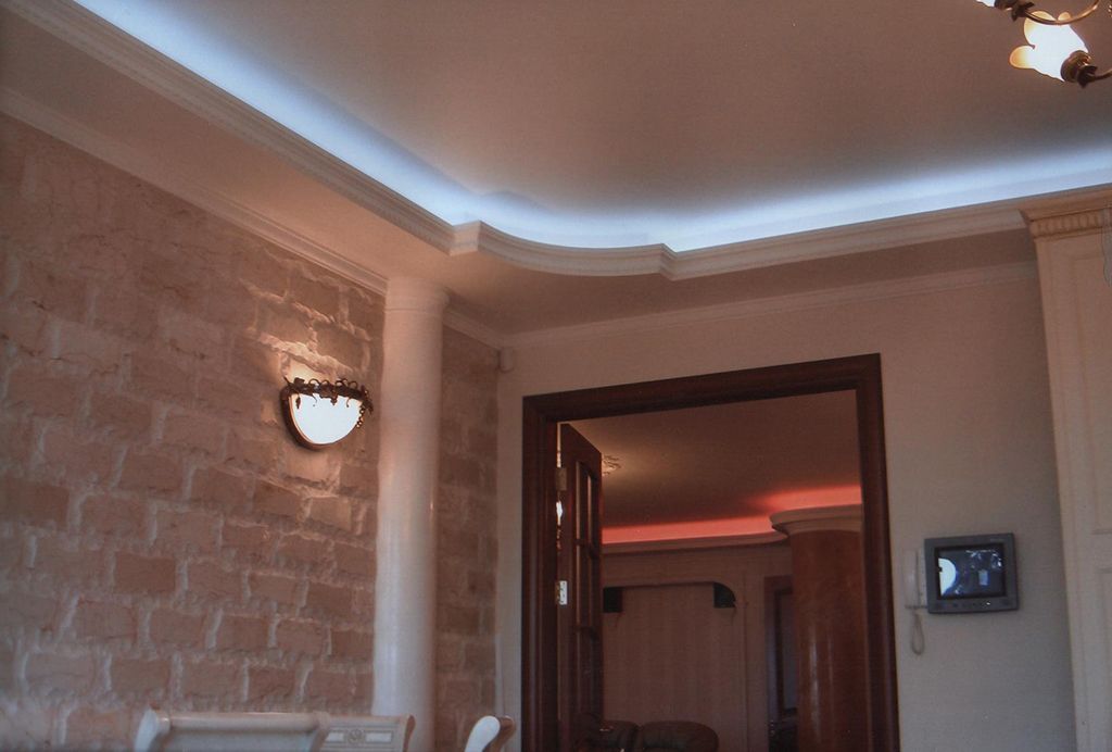 Начнем с подсветки потолка, которая присутствует во всех помещениях данного объекта. Светодиодная лента arlight® была установлена в потолочные карнизы и ниши многоуровневых потолков. Светодиодная подсветка не только подчёркивает декоративные формы, но и служит источником дополнительного света, который можно включать когда в основном свете нет необходимости или когда хочется, чтобы свет был мягким.
