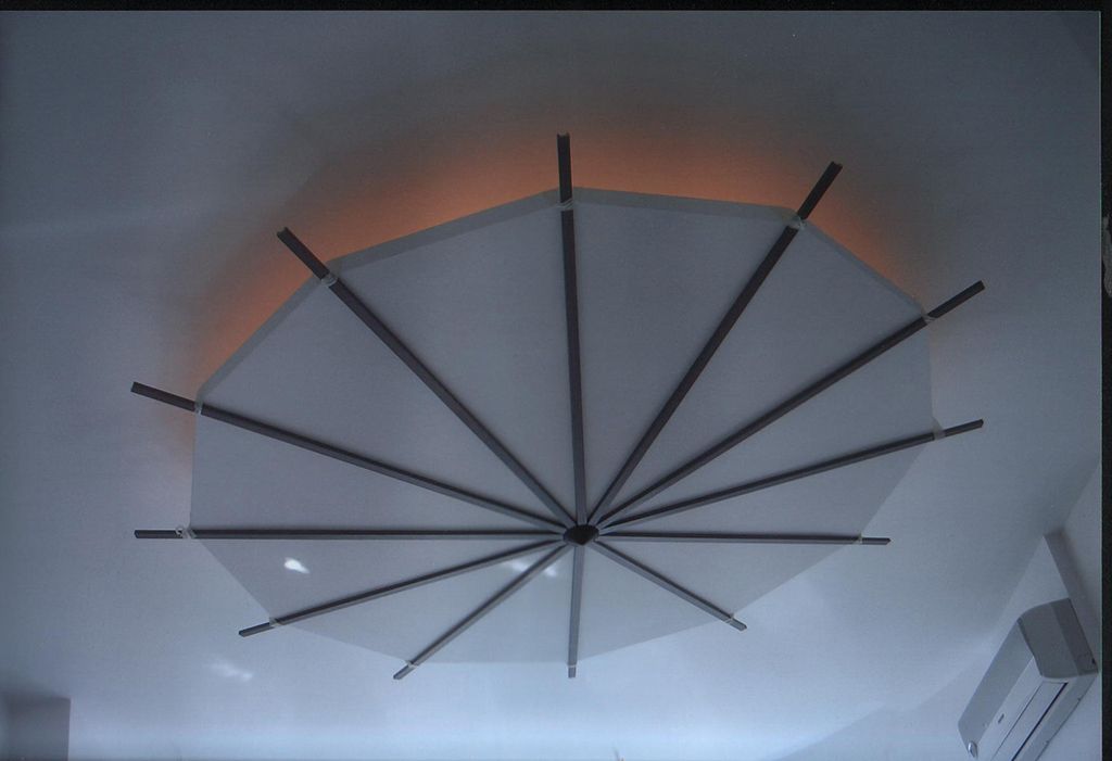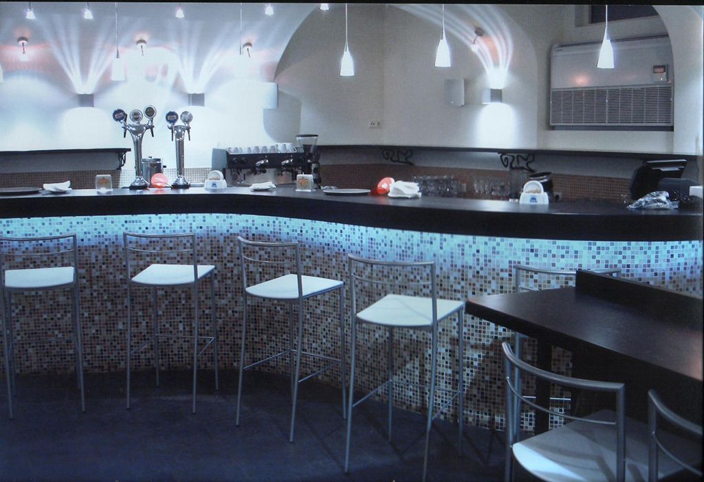 Цветная светодиодная лента arlight® была использована для декоративной подсветки: синяя - для подсветки барной стойки, оранжевая - для подсветки декоративной инсталляции - "зонтика" на потолке.