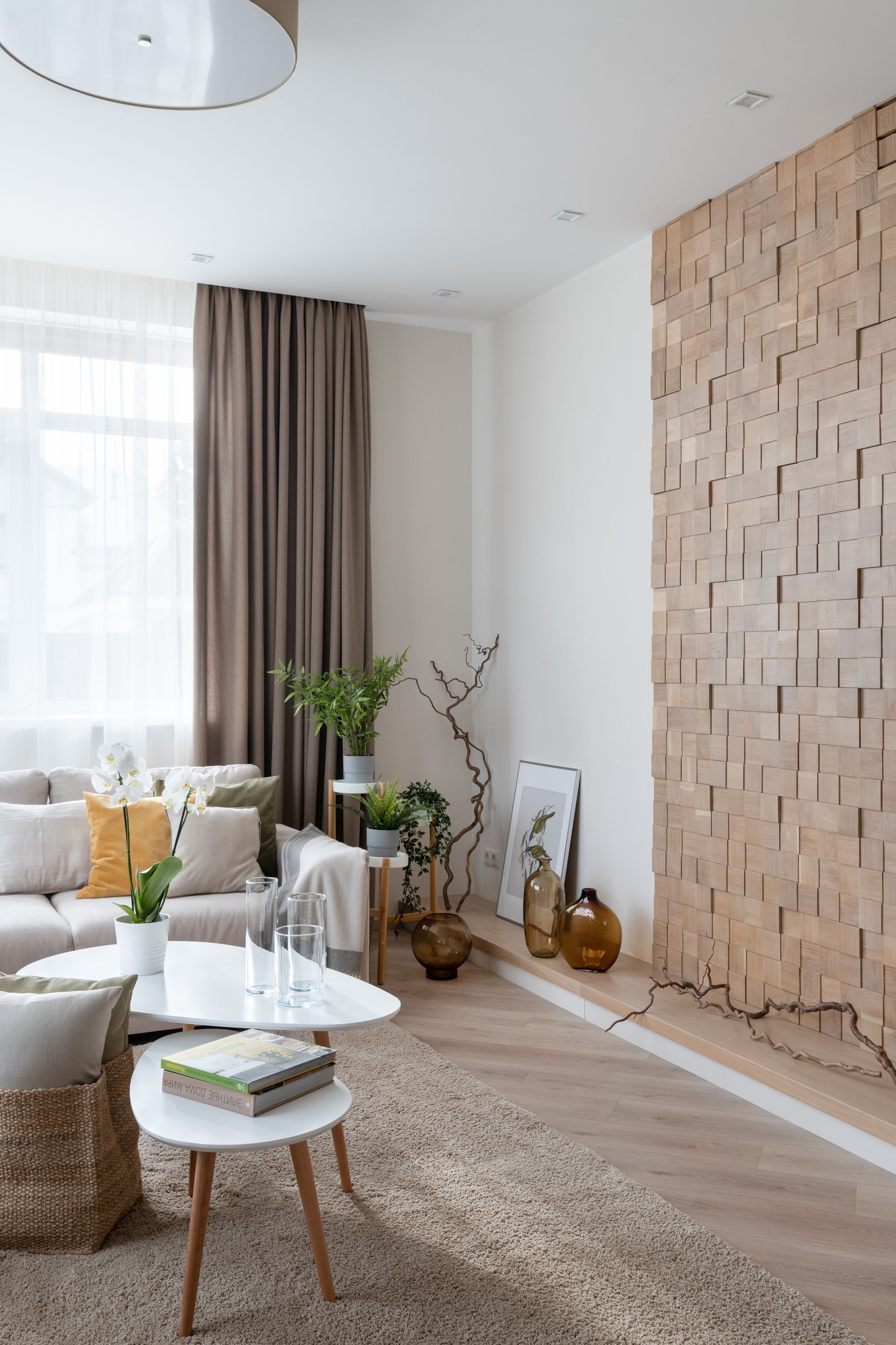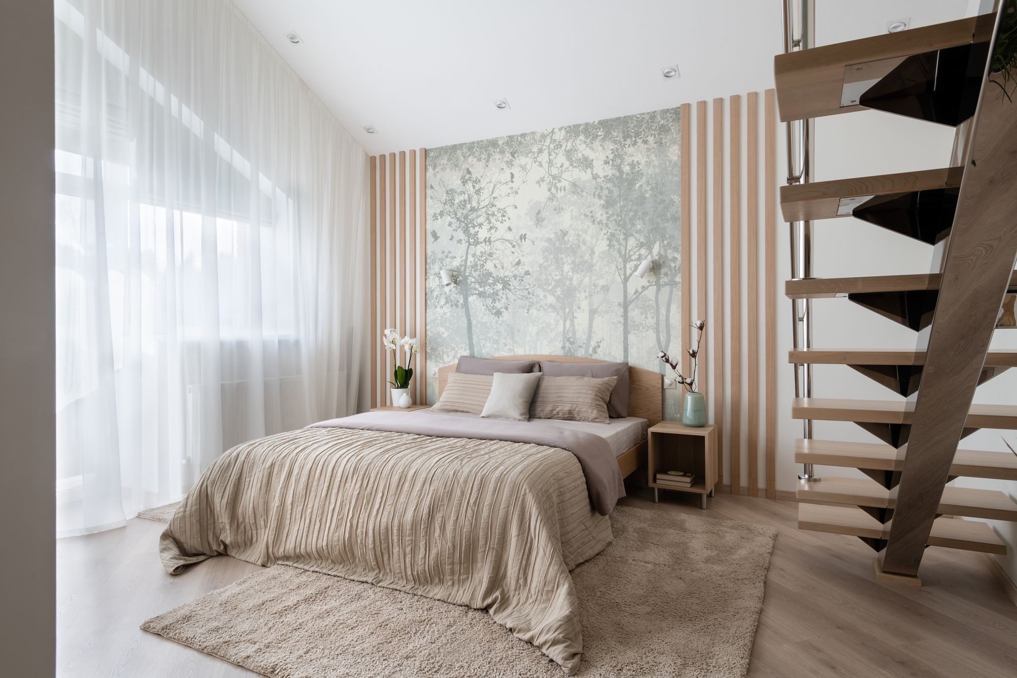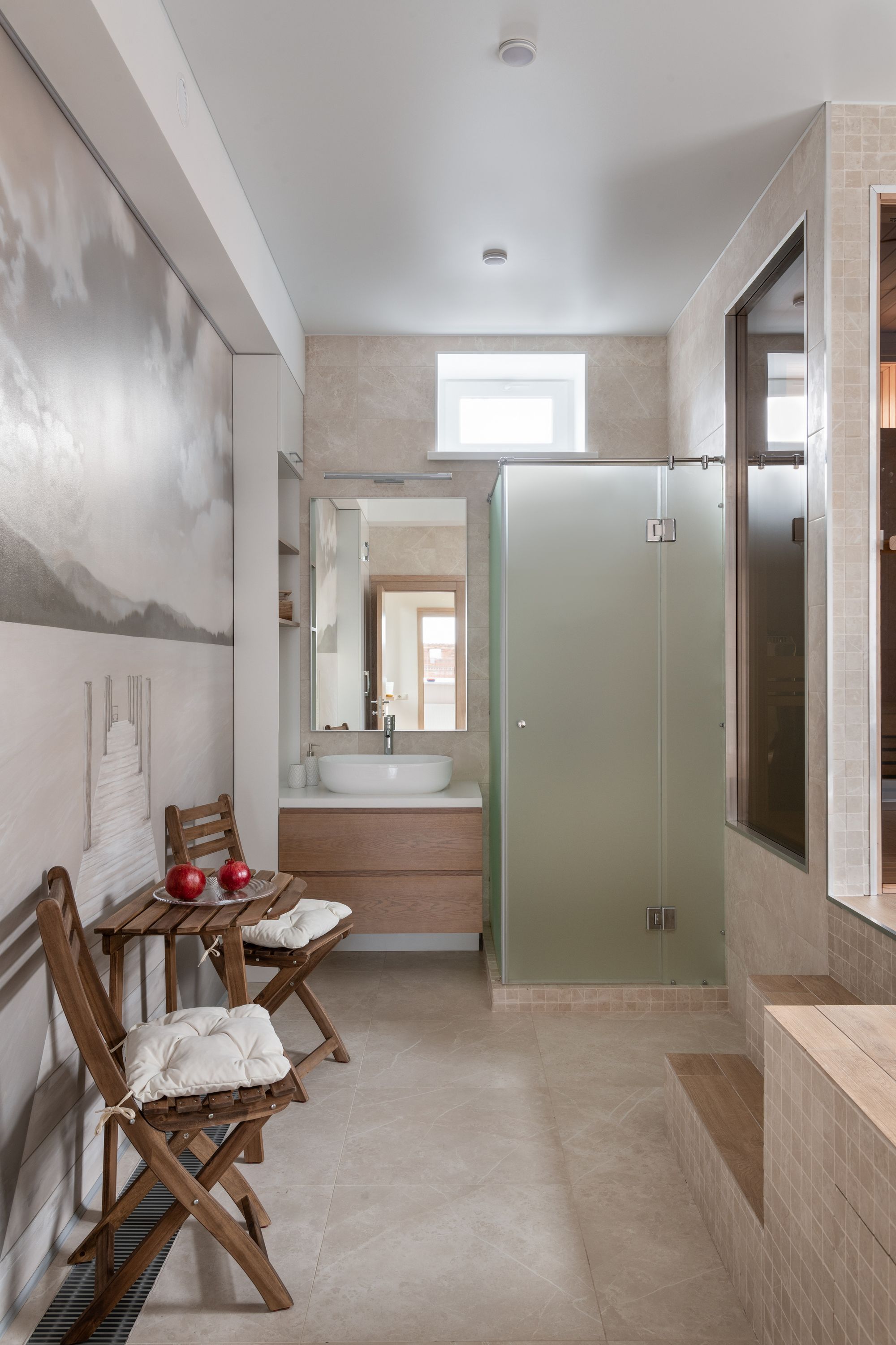 Общая дизайн-тенденция проекта: спокойные природные тона и аналогичное нейтральное освещение. Во всех помещениях применяются встроенные потолочные светильники, в мансарде и детской комнате — поворотные светильники с регулируемым углом излучения света для создания разных световых сценариев. Для освещения в СПА-зоне выбран анодированный профиль со светодиодной лентой. Встроенная потолочная светодиодная панель с пультом управления позволяет реализовать статическое или динамическое освещение для создания комфортного освещения в разных ситуациях. Например, принимая ванну, удобно управлять цветом и светом с помощью пульта. Для подсветки рабочей зоны кухни используется анодированный профиль с лентой. Для основного потолочного освещения выбраны накладные круглые потолочные светильники. В гостиной и эркерной зоне используются встроенные светильники со стеклянной декоративной рамкой. Почти в каждом помещении предпочтение отдано источникам света с теплым белым цветом свечения.